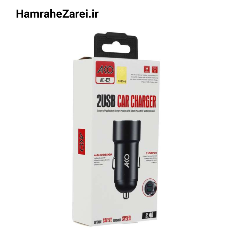 شارژر فندکی آکو ✅مخصوص شارژ کردن گوشی در خودرو ✅دارای ۲ خروجی USB ✅توان خروجی 2.4A